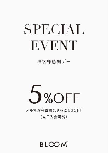 2026年2月27日(金)UP! お客様感謝デー✨BLOOM商品5%OFF 本日はお客様感謝デー BLOOMプライス商品 通常価格より5%OFF! また、モバイル会員様はさらに5%OFF!! 新作商品も、トレンドのゴールドカラージュエリーも たくさん取り揃えております モバイル会員様へは当日ご入会も可能です 詳しくは店舗スタッフまでお尋ねください 皆さまのご来店を心よりお待ちしております
