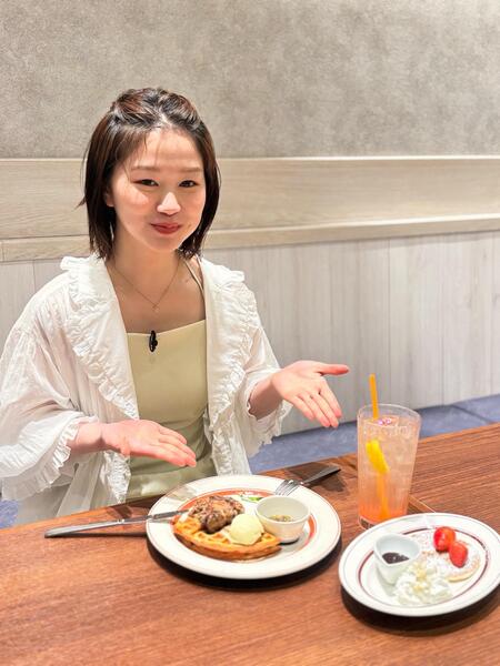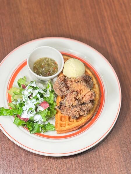 ワッフルに唐揚げを乗せてメープルシロップをかける
