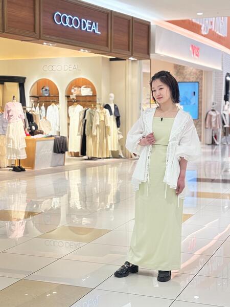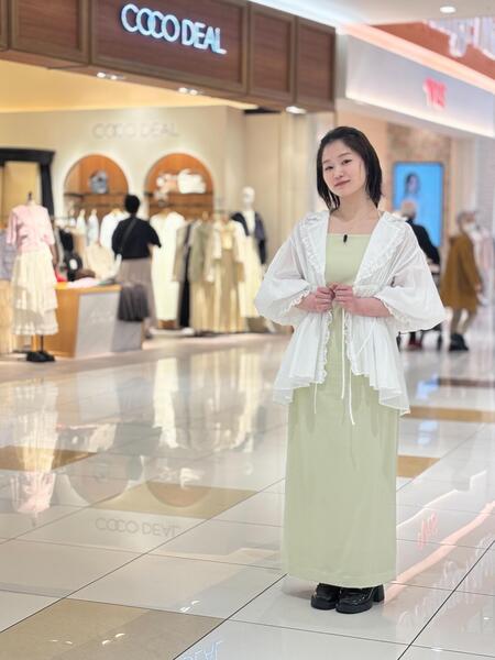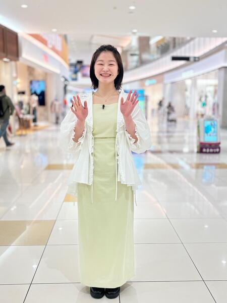 パステルグリーンのワンピースと少し透け感のあるブラウスの組み合わせが